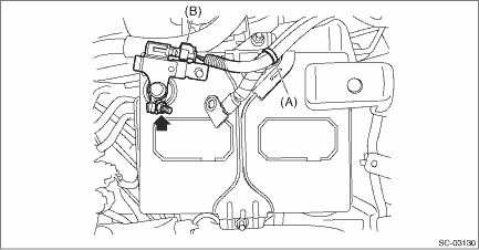1. Install the battery sensor, and connect the connector (B) to the battery sensor. Tightening torque: 6 N·m (0.6 kgf-m, 4.4 ft-lb) 2. Attach the clip (A) to the battery holder.