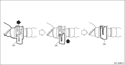 3. Connect the vent tube (A), canister drain tube (B) and purge tube (C), and install the hose clamp (D). CAUTION: • Make sure there are no damage or dust on connections. If necessary, clean the seal surface of the pipe. • Make sure that the quick connector is securely connected. NOTE: Connect the quick connector as shown in the figure. • Vent tube (A) and canister drain tube (B) (Slider color is red or green.)