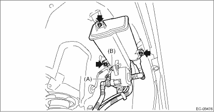 5. Install the canister. Tightening torque: 8 N·m (0.8 kgf-m, 5.9 ft-lb) 6. Connect the connector (A) to the canister and install the harness clip (B).