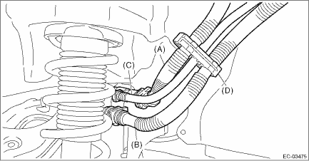 7. Connect the quick connectors of the vent tube (A), canister drain tube (B) and purge tube (C), and install the tube clamp (D). CAUTION: • Make sure there are no damage or dust on connections. If necessary, clean the seal surface of the pipe. • Make sure that the quick connector is securely connected. NOTE: Connect the quick connector as shown in the figure. • Vent tube (A) and canister drain tube (B) (Slider color is red or green.)
