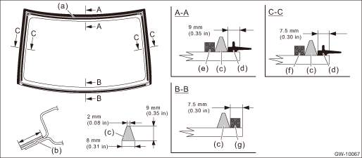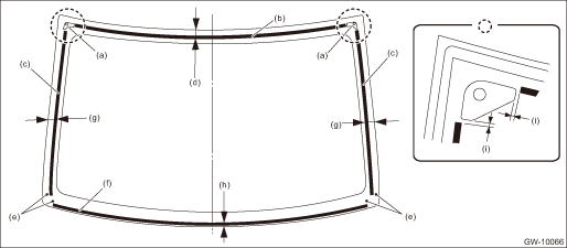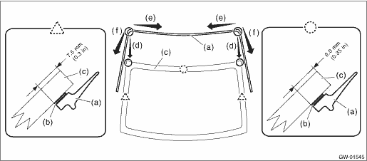 (1) Align the molding - rear window (a) to the upper ends (d) of the glass - rear window (c). (2) Install the molding - rear window from both corners of the upper edge toward the center. (e) (3) Install the molding - rear window from both corners of the upper edge toward the bottom. (f) (4) Firmly apply the double sided tape (b) of the molding - rear window evenly to the surface of the glass - rear window. 5. Install the glass - rear window in the same procedure as for the glass - front window. Windshield Glass > INSTALLATION (1) Apply the primer to the adhesive surface of glass - rear window side and body side using sponge. (2) Apply adhesive to the end back surface of the glass - rear window. CAUTION: Do not apply primer to adhesive remaining on the body side.
