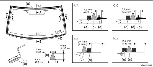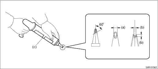 CAUTION: • For model with EyeSight, always use Subaru genuine windshield glass specially designed for EyeSight. (If the windshield glass other than the glass specially designed for EyeSight is used, the visibility of the camera is blocked or the distortion of the glass prevents the correct measurement of the object, resulting in the EyeSight abnormal operation.) • For model with EyeSight, if the windshield glass is installed after removal or replaced, always perform the “Inspection” and “Adjustment and check” of the stereo camera. Inspection: General Description > INSPECTION Adjustment and check: Camera Adjustment, Inspection • For model with EyeSight, if the damage is found in the glass repair prohibited area, always replace the glass. Damage in the prohibited area can affect the recognition of the stereo camera even if it is repaired, and thereby EyeSight function may not operate properly. 1. Fabricate the cartridge nozzle tip as shown and set the sealant gun with the adhesive.