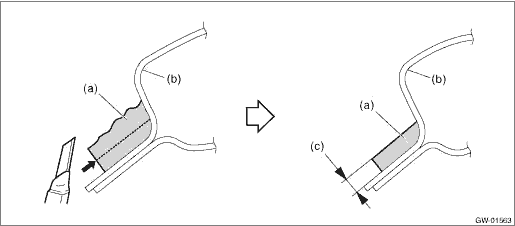 2. Remove the adhesive layer on the body using cutter knife to obtain smooth face of 2 mm (0.08 in) thick. CAUTION: • Be careful not to damage the body and paint surface. • Be sure to keep some amount of old adhesive.