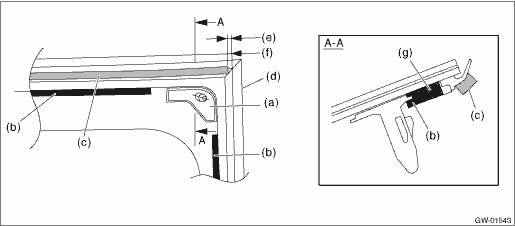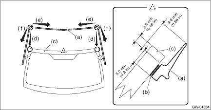 5. Attach the molding - front window to the glass - front window. (1) Align the molding - front window (a) to the upper ends (d) of the glass - front window (c). (2) Install the molding - front window from both corners of the upper edge toward the center. (e) (3) Install the molding - front window from both corners of the upper edge toward the bottom. (f) (4) Firmly apply the double sided tape (b) of the molding - front window evenly to the surface of the glass - front window. CAUTION: Be careful to attach the molding - front window so that the molding has no loose or undulating part.