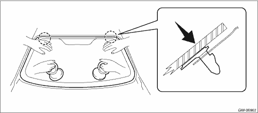(4) Lightly press the entire perimeter of the glass - front window for tight fit. (5) Make flush the adhesive surface jutted out using spatula. 8. After completion of all work, allow the vehicle to stand for about 24 hours. NOTE: • When opening/closing the door after the glass - front window was bonded, always lower the glass assembly - door first, and then open/close it carefully. • Move the vehicle slowly. • For minimum drying time and vehicle standing time before driving after bonding, follow instructions or instruction manual from the adhesive manufacturer. 9. Connect the wiper deicer connector. (Models with wiper deicer) 10. Install the cowl panel assembly. Cowl Panel > INSTALLATION 11. Install the stereo camera cover and stereo camera. (Models with EyeSight) Stereo Camera > INSTALLATION 12. Install the trim panel - front pillar UPR. Upper Inner Trim > INSTALLATION 13. Connect the ground terminal to battery sensor. (Models with wiper deicer) NOTE 14. After curing of adhesive, pour the water on external surface of vehicle to check that there are no water leaks. NOTE: When a vehicle is returned to the user, tell him or her that the vehicle should not be subjected to heavy impact for at least three days. |