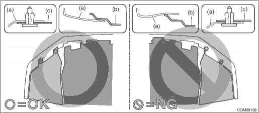 CAUTION: Install so that the front end of the under cover (b) comes inside the bumper face - front (a), and the front end of the mud guard (c) comes outside the bumper face - front (a).