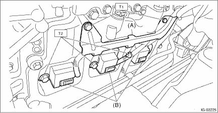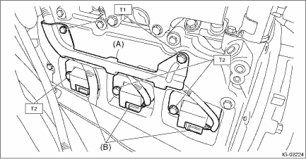2. Install the ignition coil. NOTE: Turn the #5 ignition coil to install it. 3. Connect the connector (B) to the ignition coil. 4. Install the engine harness stay (A). Tightening torque: T1: 6.4 N·m (0.7 kgf-m, 4.7 ft-lb) T2: 16 N·m (1.6 kgf-m, 11.8 ft-lb)