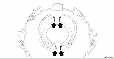 CAUTION: If the steering wheel and steering angle sensor are removed, perform “VDC sensor midpoint setting mode” of the VDC. VDC Control Module and Hydraulic Control Unit (VDCCM&H/U) > ADJUSTMENT 1. Before attaching a new roll connector, apply a thin coat of grease contained in the connector onto the areas shown by the arrows.