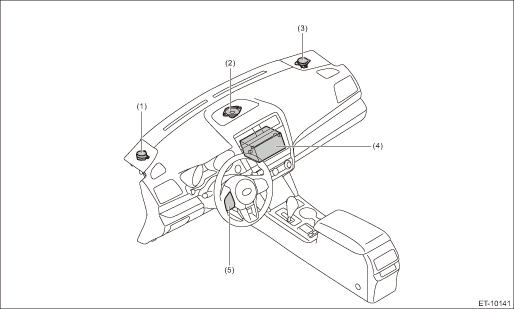 1. AUDIO AND NAVIGATION SYSTEM (1) | Speaker ASSY - tweeter LH | (3) | Speaker ASSY - tweeter RH | (5) | Satellite switch assembly | (2) | Speaker ASSY - center | (4) | Audio ASSY or navigation ASSY | | |