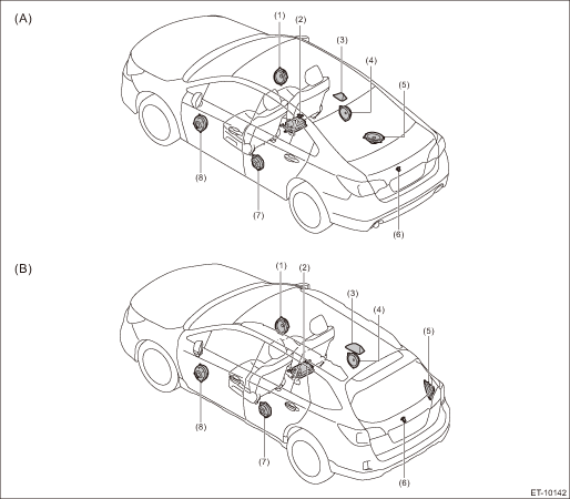 (A) | Sedan model | (B) | OUTBACK model | | | | | | | | | | (1) | Front door speaker ASSY RH | (4) | Rear door speaker ASSY RH | (7) | Rear door speaker ASSY LH | (2) | Power amplifier - ASSY | (5) | Woofer ASSY | (8) | Front door speaker ASSY LH | (3) | Antenna ASSY - roof | (6) | Rearview camera ASSY | | |