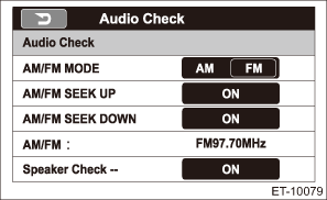 7. Touch the {ON} key of {Speaker Check} to check speaker output. NOTE: • The speaker front left > front right > rear right > rear left will sound in order for 2 seconds each. • The speaker sounds at the maximum volume during speaker check. • Press the {BACK} key to return to the {Line Diag} screen. Model with 7 inch display Operation is the same as that of navigation assembly, therefore, refer to “Navigation System”. Navigation System > OPERATION |