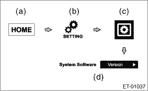 1. SUBARU STARLINK CONNECTION ID DISPLAY Model with 6.2 inch display 1. Turn the ignition switch to ACC. 2. Press the HOME button (a) to display the {HOME} screen. 3. Touch the {SETTINGS} (b) to display the {SETTINGS} screen. 4. Touch the {Settings General} (c) to display the {Settings General} screen. 5. Touch the {Version} (d) in {System Software}.