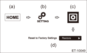 6. Confirm the Serial Number (8 digits). Model with 7 inch display Operation is the same as that of navigation assembly, therefore, refer to “Navigation System”. Navigation System > OPERATION 2. SOFTWARE VERSION DISPLAY Model with 6.2 inch display 1. Perform the same procedure as for the SUBARU STARLINK connection ID display. Audio System > OPERATION 2. Confirm the Software Ver. Model with 7 inch display Operation is the same as that of navigation assembly, therefore, refer to “Navigation System”. Navigation System > OPERATION 3. INITIALIZATION (FACTORY DEFAULT) Model with 6.2 inch display 1. Turn the ignition switch to ACC. 2. Press the HOME button (a) to display the {HOME} screen. 3. Touch the {SETTINGS} (b) to display the {SETTINGS} screen. 4. Touch the {Settings General} (c) to display the {Settings General} screen. 5. Touch the {Restore} (d) in {Reset to Factory Settings}.