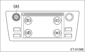 OK: Each connection device is connected properly. NG: No connection or abnormal connection is detected. NOTE: Check the external connection terminals (USB 1, 2 and AUX) by connecting a memory for check or a pin jack. Model with 7 inch display Operation is the same as that of navigation assembly, therefore, refer to “Navigation System”. Navigation System > OPERATION 5. CHECK VEHICLE SIGNALS WITH LINE DIAG MODE Model with 6.2 inch display 1. Turn the ignition switch to ACC. 2. Press the button (a) to display the Audio OFF screen. 3. Touch the screen in order from (b) to (e).