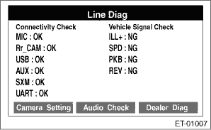 NOTE: Pressing the button (a) or turning the ignition switch from the OFF to ACC position can exit the Line Diag mode. 4. {Line Diag} screen is displayed. 5. Check the connection status with the {Connectivity Check} in the {Line Diag} screen.