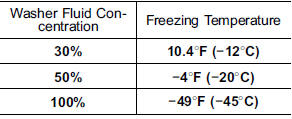 In order to prevent freezing of washer fluid, check the freezing temperatures in the table above when adjusting the fluid concentration to the outside temperature. If you fill the reservoir tank with a fluid with a different concentration from the one used previously, purge the old fluid from the piping between the reservoir tank and washer nozzles by operating the washer for a certain period of time. Otherwise, if the concentration of the fluid remaining in the piping is too low for the outside temperature, it may freeze and block the nozzles.