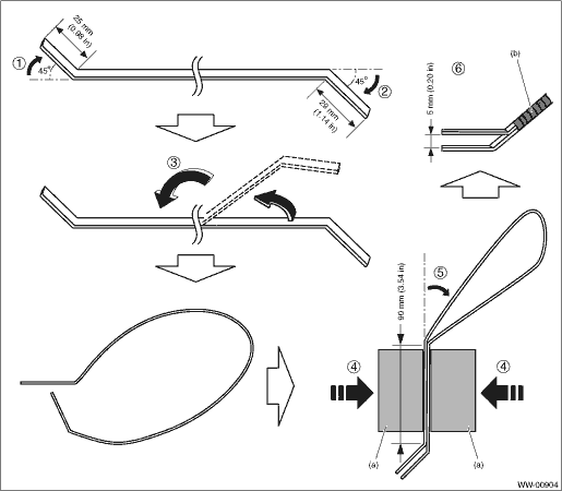(1) Bend the vertebra at the position 25 mm (0.98 in) away from its end by 45°. (2) Bend the vertebra at the position 29 mm (1.14 in) away from the other end by 45°. (3) Double up the vertebra so that the longer end (29 mm (1.14 in)) comes upward. (4) Secure the vertebra with a vise (a) so that the tip clearance becomes 5 mm (0.20 in). (5) Bend the vertebra at the position approximately 90 mm (3.54 in) away from the bending point for the longer end. (6) Check that the tip clearance is 5 mm (0.20 in), and secure the vertebra with vinyl tape (b). |