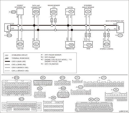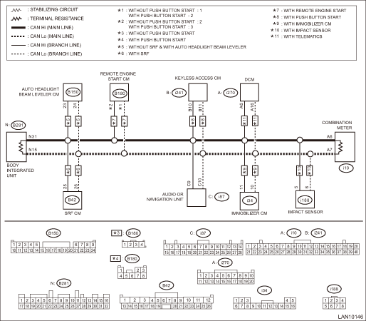 2. BODY-CAN NOTE: • When measuring the resistance of CAN communication circuit, measure it in sleep status. To enter sleep status – With ignition switch OFF and key or switch operation stopped, keep the doors, trunk, and rear gate all closed for one minute or more. – On models with keyless access function, keep the access key 2 m or more away from the vehicle. • When the bus line is measured, combined resistance of the end resistance (120 -) in body integrated unit and the end resistance (120 -) in combination meter can be measured. The combined resistance is supposed to be approximately 53 — 61 - with the stabilizing circuit included. If the measured resistance value becomes 52 - or less, main wiring harness or related lines may be shorted. Or, the combined resistance may have changed because of a resistance other than the end resistance created on the circuit. If the measured value is 62 - or more, there may be a malfunction such as open circuit in one of the end resistances, in the stabilizing circuit, or in the main wiring harness. Also, even when the resistance value falls within approx. 53 — 61 -, related lines may be open if an error of communication for initializing or a CAN system U-code has occurred. (The resistance cannot be between approx. 53 — 61 - if the main wiring harness is open.) WIRING DIAGRAM: • For the coupling connector, refer to “WIRING SYSTEM”. • CAN communication system CAN Communication System > WIRING DIAGRAM