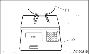 1. Attach the manifold gauge set. Preparation tool: Manifold gauge set (1) Check that all valves are fully closed. (2) Install the low/high pressure hoses to the service ports on the low/high pressure sides of the vehicle respectively. CAUTION: Confirm that the connections are secure. (3) Connect the center manifold hose of the manifold gauge to the vacuum pump. Preparation tool: Vacuum pump 2. Perform evacuation. CAUTION: Make sure to perform evacuation using a vacuum pump. (1) Open the low-pressure valve, high-pressure valve and center valve. (2) Operate the vacuum pump. (3) Perform evacuation for 5 minutes or more, and when the low pressure gauge needle reaches -0.1 MPa (-1 kgf/cm2, −14 psi), close the center manifold hose valve, and stop the vacuum pump. (4) Leave alone for 5 to 10 minutes after closing the low pressure and high pressure valves, and check whether there is any change in the low pressure gauge needle indication. If the needle position changes, this indicates a leak. Check the pipe and hose connections, and repair the location with the problem. After repair, retry charging the refrigerant from the step 1). (5) If there is no leakage, continue evacuation for additional 20 — 30 minutes, close all valves and then stop the vacuum pump. 3. Charge refrigerant. (1) Follow the can tap operation manual to attach it to the refrigerant can. Preparation tool: Can tap (2) Disconnect the center manifold hose from the vacuum pump, and connect the hose to the tap valve. Preparation tool: Weight scale NOTE: When 13.6 kg (30 lb) refrigerant container (1) is used, measure the amount of refrigerant with a refrigerant charging scale (2), and connect with the center manifold hose.