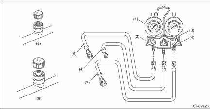 CAUTION: • During operation, be sure to wear protective goggles and protective gloves. • Connect the refrigerant recovery system with the manifold gauge set to discharge the refrigerant from the A/C system and recycle the gas. • When recycling the discharged refrigerant, keep service cans on hand. Because the recovery rate with the recovery system is approx. 90%, service cans are necessary to charge the refrigerant. • Follow the detailed operation procedure described in the operation manual attached to the refrigerant recovery system.