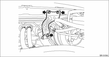 CAUTION: • Do not allow brake fluid to come in contact with the painted surface of the vehicle body. If it does, wash off with water and wipe away completely. • Before handling the airbag system components, always refer to “CAUTION” of “General Description” in “AIRBAG SYSTEM”. General Description > CAUTION 1. Disconnect the ground terminal from the battery sensor, and wait for at least 60 seconds before starting work. NOTE 2. Remove the vacuum hose. 3. Remove the master cylinder assembly. Master Cylinder > REMOVAL 4. Remove the bolts and nuts, and then remove the clutch bracket. (MT model)