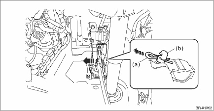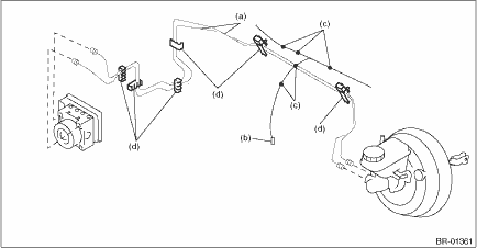 5. Remove the ECM and ECM bracket. • H4 model: Engine Control Module (ECM) > REMOVAL • H6 model: Engine Control Module (ECM) > REMOVAL 6. Remove the brake pipe assembly (a). (1) Disconnect the starter connector (b) and harness clip (c). (2) Remove the brake pipe assembly (a) from the pipe clip (d).