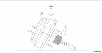 11. Remove the vacuum booster assembly. CAUTION: • Do not disassemble the vacuum booster assembly. • Make sure that the booster shell and vacuum pipe are not subject to strong impacts. • Be careful not to drop the vacuum booster assembly. If the vacuum booster assembly is dropped accidentally, replace it. • Be careful when placing the vacuum booster assembly on floor. • If external force (a) is applied from above when the vacuum booster assembly is placed in this position, the resin portion as indicated by “P” may become damaged.