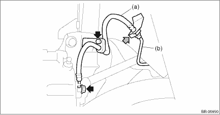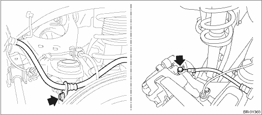 1. FRONT BRAKE HOSE 1. Disconnect the brake hose (a) and the brake pipe (b). Tools used: Flare nut wrench 2. Remove the clamp, strut mounting bolt and union bolt, and remove the front brake hose.