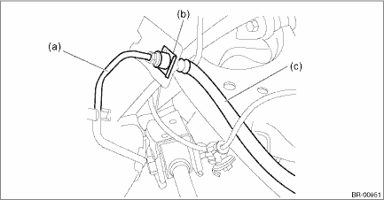 2. Disconnect the brake pipe (a). Tools used: Flare nut wrench 3. Remove the brake hose clamp (b), and remove the rear brake hose (c).