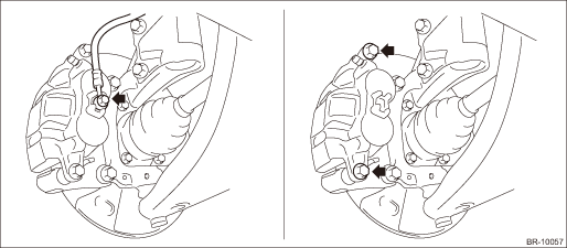 1. 16-INCH TYPE 1. Lift up the vehicle, and then remove the front wheels. 2. Remove the union bolt and the caliper bolt, and remove the caliper body assembly. CAUTION: • Do not allow brake fluid to come in contact with the painted surface of the vehicle body. If it does, wash off with water and wipe away completely. • Prepare a container to catch grease or oil, etc. If any grease or oil spills, wipe it off and clean immediately to prevent from penetrating into floor or flowing outside.