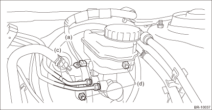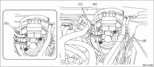 (1) Disconnect the fluid level gauge connector (a). (2) Disconnect the clutch hose (b). (MT model) (3) Disconnect the brake pipe (c). (4) Remove the nut (d), and slowly remove the master cylinder from the brake booster. • H4 model