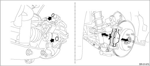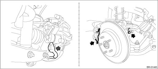 1. Release the parking brake. 2. Using the Subaru Select Monitor, go to the brake maintenance mode according to the display screen. Parking Brake System > OPERATION NOTE: For detailed operation procedures, refer to “Application help”. 3. Disconnect the ground terminal from battery sensor. NOTE 4. Lift up the vehicle, and then remove the rear wheels. 5. Remove the pad - disc brake rear. (1) Disconnect the connector. (2) Remove the pad clip and the brake hose bracket.