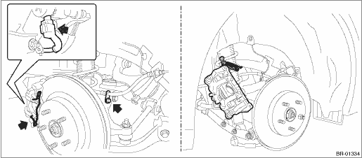 1. Release the parking brake. 2. Using the Subaru Select Monitor, go to the brake maintenance mode according to the display screen. Parking Brake System > OPERATION NOTE: For detailed operation procedures, refer to “Application help”. 3. Disconnect the ground terminal from battery sensor. NOTE 4. Lift up the vehicle, and then remove the rear wheels. 5. Remove the disc brake assembly. (1) Remove the pad clip, the connector and the brake hose bracket. (2) Remove the mounting bolt, and remove the disc brake assembly. (3) Prepare wiring harnesses etc. to be discarded, and suspend the disc brake assembly from the shock absorber assembly.
