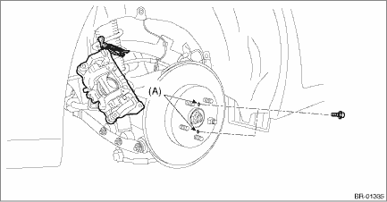 6. Remove the disc rotor. NOTE: If the disc rotor is difficult to remove, proceed as follows. When the disc rotor is difficult to be removed from the hub unit COMPL - rear axle, screw in 8 mm (0.31 in) bolt to the threaded part of the disc rotor (A), and remove the disc rotor.