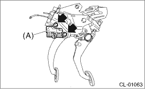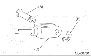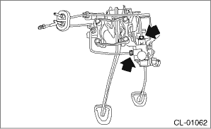 CAUTION: • Be careful not to spill the brake fluid. Brake fluid spilled on the vehicle body will harm the paint surface; wash it off with water and wipe clean quickly if spilled. • Before handling the airbag system components, refer to “CAUTION” of “General Description” in “AIRBAG SYSTEM”. General Description > CAUTION 1. Turn the ignition switch to OFF. 2. Disconnect the ground terminal from the battery sensor, and wait for at least 60 seconds before starting work. NOTE 3. Drain the brake fluid. Clutch Fluid 4. Remove the instrument panel lower cover. Instrument Panel Lower Cover > REMOVAL 5. Remove the steering column. Steering Column > REMOVAL 6. Remove the pedal assembly. Clutch Pedal > REMOVAL 7. Remove the clip and clevis pin, and then remove the push rod of the master cylinder.