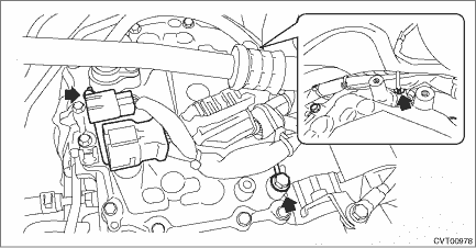 10. Remove the transmission harness connector from the harness stay. 11. Remove the TCM. Transmission Control Module (TCM) > REMOVAL 12. Remove the throttle body, and move it aside so that it will not interfere with the removal of the control valve. Throttle Body > REMOVAL NOTE: Do not remove the preheater hose. 13. Clean the transmission exterior. 14. Fix the ST with tape, and set the ST to the vehicle. NOTE: When replacing the control valve body, the sheet is included in the control valve body for repairs.