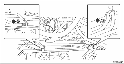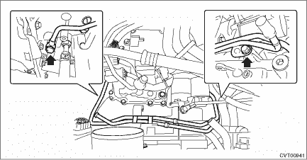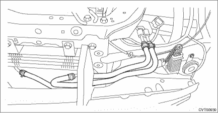 CAUTION: • Immediately after the vehicle has been running or after idling for a long time, the CVTF will be hot. Be careful not to burn yourself. • If the CVTF is spilt over exhaust pipe, wipe it off with cloth to avoid emitting smoke or causing a fire. • When removing the CVTF cooler pipe assembly on vehicle side, be careful not to bend the A/C pipe. 1. Lift up the vehicle. 2. Remove the under cover - front. 3. Remove the CVTF CVT inlet hose and CVTF CVT outlet hose.