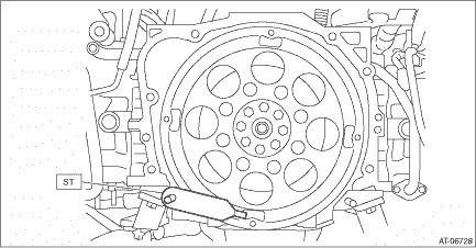 1. Remove the transmission assembly. Automatic Transmission Assembly > REMOVAL 2. Set the ST. NOTE: Set the ST to the drive plate referring to the illustration.