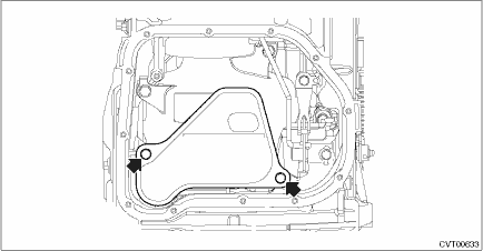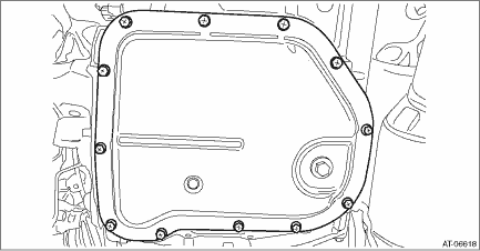 CAUTION: • Directly after the vehicle has been running or the engine has been idling for a long time, the CVTF is hot. Be careful not to burn yourself. • Be careful not to spill CVTF on the exhaust pipe to prevent it from emitting smoke or causing a fire. If the CVTF adheres, wipe it off completely. 1. Lift up the vehicle. 2. Remove the under cover - front. 3. Clean the transmission exterior. 4. Remove the CVTF drain plug to drain CVTF. 5. Remove the oil pan. CAUTION: Be careful not to allow foreign matter such as dust or dirt to enter the oil pan.