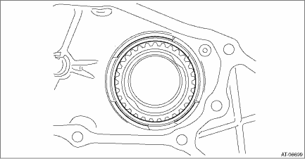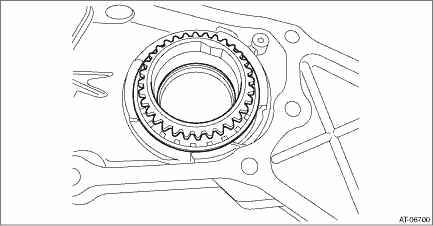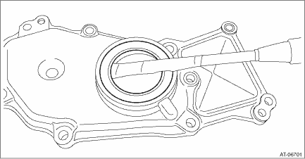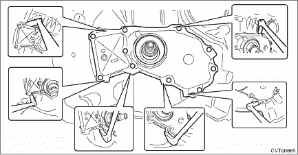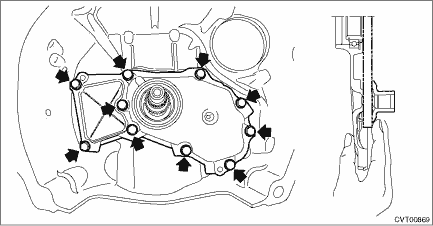 1. Remove the transmission assembly. Automatic Transmission Assembly > REMOVAL 2. Remove the torque converter assembly. Torque Converter Assembly > REMOVAL 3. Remove the oil pump chain cover. NOTE: Oil pump chain cover may be hard to remove because the driven sprocket is installed to the shaft side of the oil pump. Do not remove it forcibly. Remove it while holding the driven sprocket by hand.