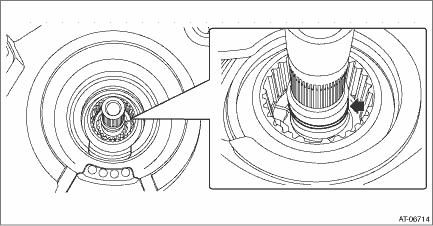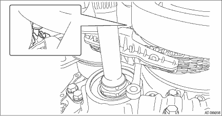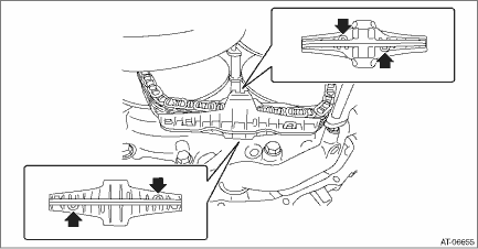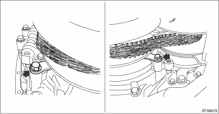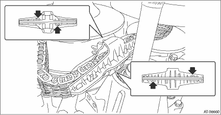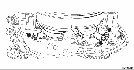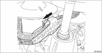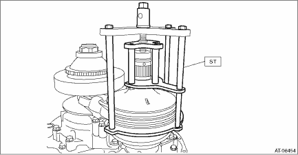 NOTE: Always replace primary pulley and secondary pulley as an assembly because they are non-disassembled parts. 1. Remove the transmission assembly. Automatic Transmission Assembly > REMOVAL 2. Remove the air breather hose. Air Breather Hose > REMOVAL 3. Remove the control valve body. Control Valve Body > REMOVAL 4. Remove the transmission harness. Transmission Harness > REMOVAL 5. Remove the turbine speed sensor. Turbine Speed Sensor > REMOVAL 6. Remove the secondary speed sensor. Secondary Speed Sensor > REMOVAL 7. Remove the primary speed sensor. Primary Speed Sensor > REMOVAL 8. Remove the inhibitor switch. Inhibitor Switch > REMOVAL 9. Remove the extension case. Extension Case > REMOVAL 10. Remove the transfer clutch assembly. Transfer Clutch > REMOVAL 11. Remove the transfer driven gear assembly. Transfer Driven Gear > REMOVAL 12. Remove the parking pawl. Parking Pawl > REMOVAL 13. Remove the reduction driven gear assembly. Reduction Driven Gear > REMOVAL 14. Remove the oil pan and oil strainer. Oil Pan and Strainer > REMOVAL 15. Remove the transmission control device. Transmission Control Device > REMOVAL 16. Remove the transmission case. Transmission Case > REMOVAL 17. Remove the reduction drive gear. Reduction Drive Gear > REMOVAL 18. Set the ST to secondary pulley, expand the V groove of pulley, and then completely loosen the variator chain.