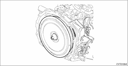 1. Remove the transmission assembly. Automatic Transmission Assembly > REMOVAL 2. Pull out the torque converter assembly horizontally. CAUTION: Do not scratch the inside of engaging parts.