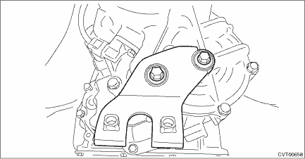 47. Remove the ST (ENGINE HANGER). 48. Remove the left and right transmission mounting brackets. NOTE: First, remove the transmission mounting bracket on the right side of vehicle, and then tilt the engine unit to remove the left transmission mounting bracket.