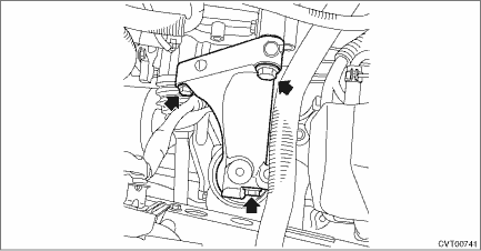 45. Lift up the engine unit high enough to install the bolt and nut to vehicle. CAUTION: Do not lift up higher than enough level to install the ST to avoid damage to the hoses and pipes inside the engine room. NOTE: If it is difficult to pull out the stud bolt from transmission mounting bracket, slightly shake the engine unit while lifting up.