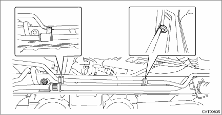 CAUTION: • Immediately after the vehicle has been running or after idling for a long time, the CVTF will be hot. Be careful not to burn yourself. • If the CVTF is spilt over exhaust pipe, wipe it off with cloth to avoid emitting smoke or causing a fire. • When removing the CVTF cooler pipe assembly on vehicle side, be careful not to bend the A/C pipe. 1. Lift up the vehicle. 2. Remove the front exhaust pipe. Front Exhaust Pipe > REMOVAL 3. Remove the CVTF CVT inlet hose and CVTF CVT outlet hose.