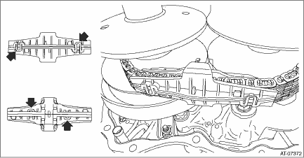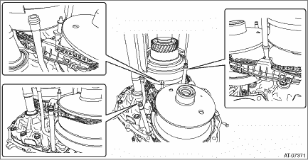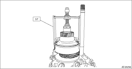 NOTE: Always replace primary pulley and secondary pulley as an assembly because they are non-disassembled parts. 1. Remove the transmission assembly from the vehicle. Automatic Transmission Assembly > REMOVAL 2. Remove the air breather hose. Air Breather Hose > REMOVAL 3. Remove the oil pan and control valve body. Control Valve Body > REMOVAL 4. Remove the transmission harness. Transmission Harness > REMOVAL 5. Remove the extension case. Extension Case > REMOVAL 6. Remove the rear drive shaft. Rear Drive Shaft > REMOVAL 7. Remove the transfer clutch assembly. Transfer Clutch > REMOVAL 8. Remove the transfer reduction driven gear assembly. Transfer Reduction Driven Gear > REMOVAL 9. Remove the intermediate case. Intermediate Case > REMOVAL 10. Remove the forward clutch assembly. Forward Clutch Assembly > REMOVAL 11. Remove the transmission case. Transmission Case > REMOVAL 12. Set the ST to the secondary pulley, and expand the V groove of pulley until the variator chain gets completely loose.