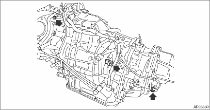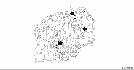 6. Remove transmission harness connector and inhibitor harness connector from harness stay. 7. Remove the control valve body. Control Valve Body > REMOVAL 8. Remove the mounting bolt to pull out the bushing of transmission harness from transmission case round hole.
