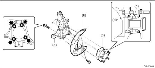 3. Remove the disc brake assembly. Front Disc Brake Assembly > REMOVAL 4. Remove the disc rotor. Front Disc Rotor > REMOVAL 5. Remove the bolts, and remove the front ABS wheel speed sensor.