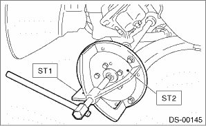 NOTE: If it is hard to remove, use the ST. Preparation tool: ST1: AXLE SHAFT PULLER (926470000) ST2: AXLE SHAFT PULLER PLATE (28099PA110)