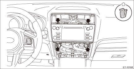 1. Disconnect the ground terminal from battery sensor. NOTE 2. Remove the center grille assembly. Air Vent Grille > REMOVAL 3. Remove the heater control assembly. Control Panel > REMOVAL 4. Remove the audio assembly. (1) Remove the screws and clips. (2) Disconnect the connector and remove the audio assembly.